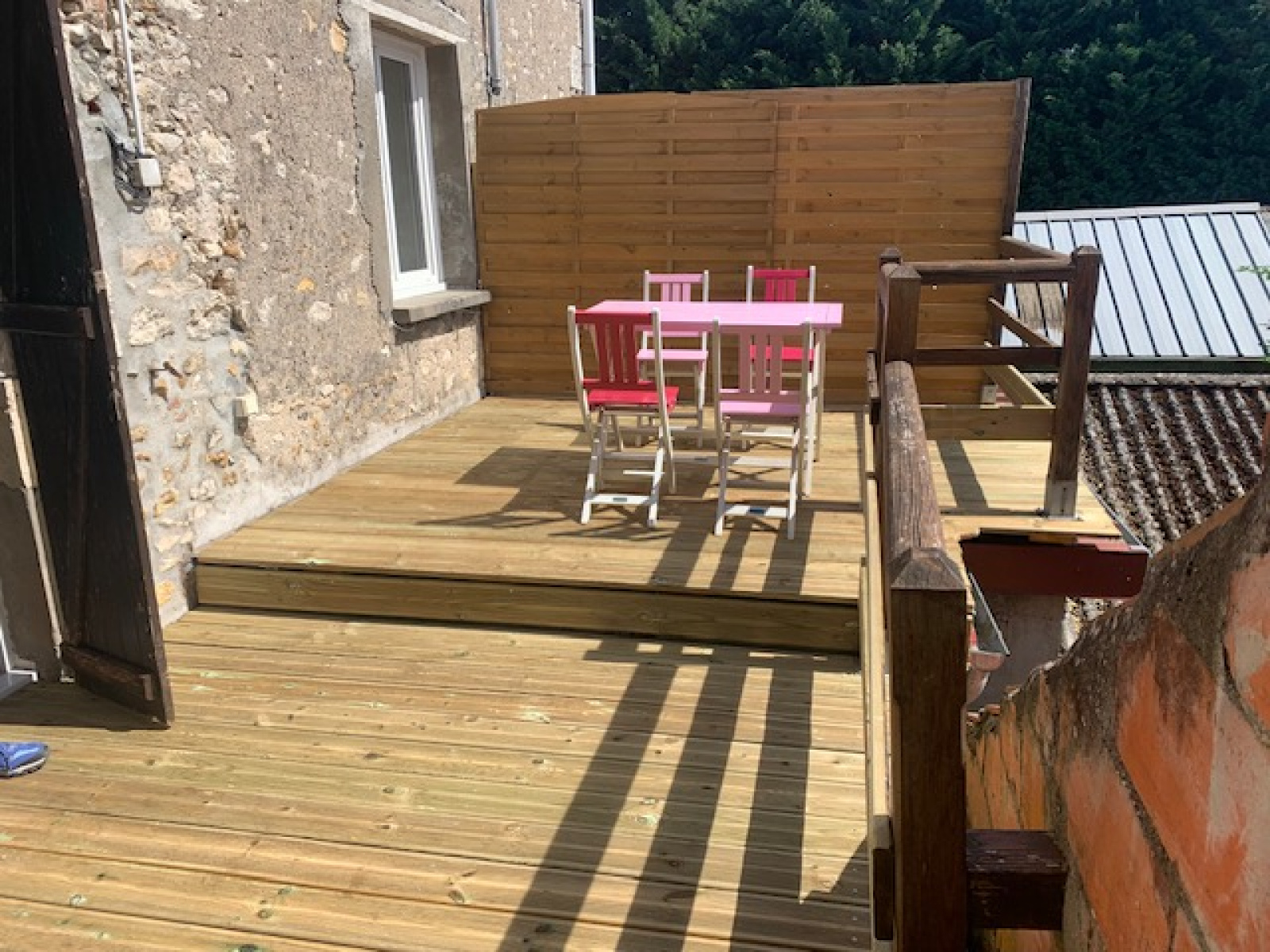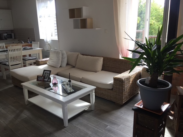 En triplex : un grand séjour avec poêle à bois et coin cuisine et terrasse, deux chambres en enfilade, une salle de bains avec wc.